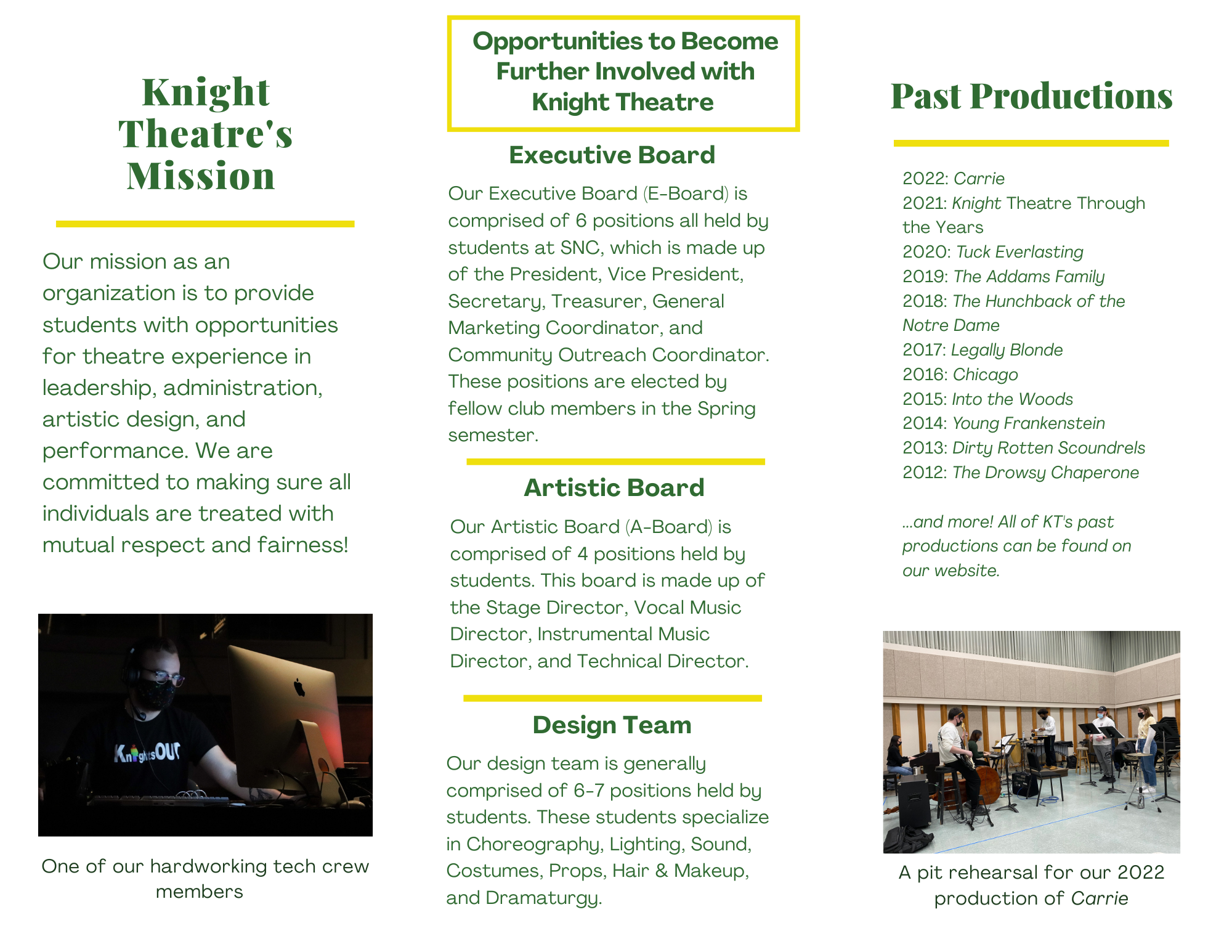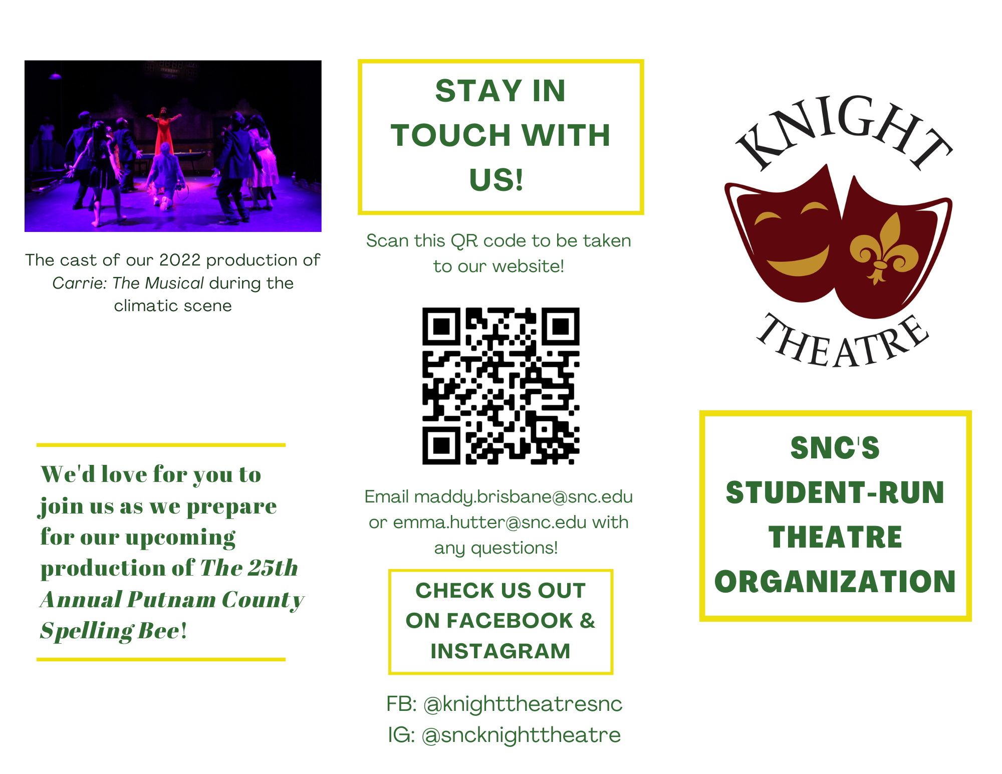 We are a completely student-run organization on the campus of St. Norbert College in De Pere, Wisconsin. Our purpose is to provide students with opportunities for theatre experience in leadership, administration, artistic design and performance. We are committed to making sure all individuals are treated with mutual respect and fairness!